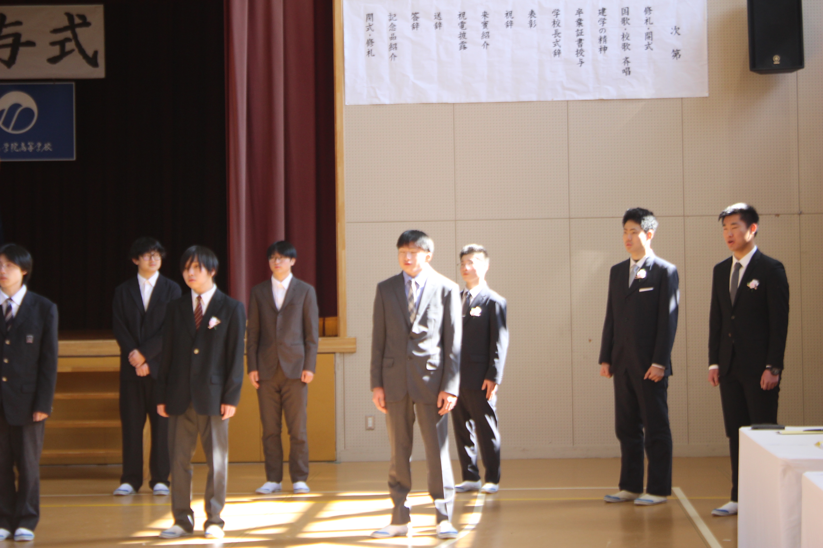 この日を迎えるまでのおよそ2週間、1・2年生の生徒達は教室の飾り付けや体育館のセッティング等を頑張っていました。この日、登校し教室に入ってきた3年生達からは驚きと喜びの声が上がっていました。迎えた式本番、校長先生から一人ひとりに卒業証書が渡されると、寮生活を送りながら勉学等に励んだ事への達成感を感じさせる表情が見て取れました。また、保護者の皆様からは晴れの舞台を迎えた我が子に対する温かい眼差しを送られていました。
